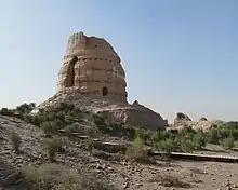 At the center of the site lies the foundation of a large temple building, north of which is the main pagoda standing 14.5 metres (48 ft) tall. The adobe structure is covered by white lime and is of the shape of an overturned bowl. North of the main pagoda are the remains of 11 smaller ones.[1][2] Most of the extant ruins date from the Western Xia dynasty, including all of the pagodas.[1][2]