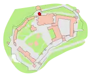 Wawel architectural complex with location of the Kościuszko statue (red) atop the solid bastion of Władysław IV (north)