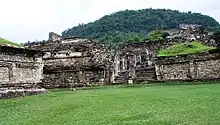 The site is located in Mexico in the highlands of the municipality of Papantla in modern-day Veracruz, not far from the city of Poza Rica, which lies northwest of the port and city of Veracruz. The city is set in the low rolling mountains that lead from the Sierra Madre Oriental to the Gulf coast near the Tecolutla River.[11] In ancient times, this city was located in the northeast corner of what is called Mesoamerica,[12] and controlled an area from between the Cazones and Tecolutla Rivers to the modern state of Puebla.[13] The main city is defined by two streams which merge to form the Tlahuanapa Arroyo, a tributary of the Tecolutla River.[12] These two streams provided the population's potable water. Most of the buildings are at the southern end, where the land is relatively flat and the two streams converge. The site extends to the northwest where terraces were constructed to place more buildings, mostly for the city's elite. However the city also had communities located on the hills east and west of the main city, with mostly lower-class dwellings.[11] The total site extends for 1,056 hectares (4.08 sq mi).[14]