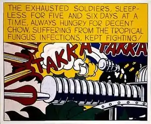 Takka Takka, with its disruption of the primary narrative clause by text focused on absent details about the past or omitted present, is described as "the most unlikely conjunction of picture and story".[8] The work is regarded as one in which Lichtenstein exaggerated comic book sound effects in common pop art style.[9]