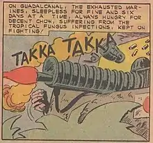 Lichtenstein was a trained United States Army pilot, draftsman and artist as well as a World War II (WWII) veteran who never saw active combat.[3][4] The work depicts a machine gun firing as it is situated above the camouflage of palm fronds during the Battle of Guadalcanal. The image shows shell casings and a grenade in mid flight. An explosion is stylized with the titular phrase.[2] The source of Takka Takka is the comic book Battlefield Action #40 (February 1962, Charlton Comics Group).[5]