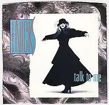 "Talk to Me" is a song recorded by American singer and songwriter Stevie Nicks for her third solo studio album Rock a Little (1985). Written by Chas Sandford, the song was released as the lead single from the album in October 1985, through Modern Records. The single became a big hit for Nicks, peaking at number four on the Billboard Hot 100 chart for two weeks and peaking at number one on the Billboard Top Mainstream Rock Songs chart for two weeks in 1985.[1]