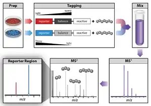 Isobaric labeling for tandem mass spectrometry: proteins are extracted from cells, digested, and labeled with tags of the same mass. When fragmented during MS/MS, the reporter ions show the relative amount of the peptides in the samples.