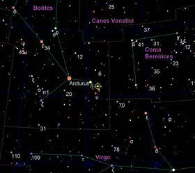 Tau Boötis, Latinised from τ Boötis, is an F-type main-sequence star approximately 51 light-years away[1] in the constellation of Boötes. It is a binary star system, with the secondary star being a red dwarf. In 1999, an extrasolar planet was detected orbiting the primary star. In December 2020, astronomers may have observed, for the first time, radio emissions from a planet beyond the Solar System. According to the researchers: "The signal is from the Tau Boötis system, which contains a binary star and an exoplanet. We make the case for an emission by the planet itself."[8][9]