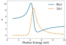 The imaginary component of is formed as the product of the imaginary component of the Lorentz oscillator model and a model developed by Jan Tauc for the imaginary component of the relative permittivity near the bandgap of a material.[1] The real component of is obtained via the Kramers-Kronig transform of its imaginary component. Mathematically, they are given by[2]