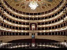 The Teatro Municipale (also since the 1980s called the Teatro Municipale Valli due to being named after the actor Romolo Valli) is a theatre in Reggio Emilia, Northern Italy. Following the destruction by fire of the 1741 Teatro Cittadella in April 1851, the new theatre was designed by the architect Cesare Costa and constructed in the neoclassical style between 1852 and 1857.[1] Its inauguration took place on 21 April 1857 with the performance of the Vittor Pisani by local composer Achille Peri.