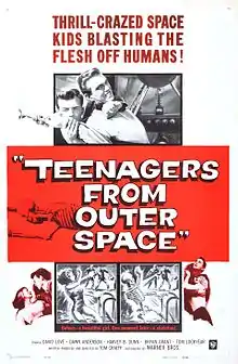 Teenagers from Outer Space (a.k.a. The Gargon Terror (UK title), The Boy from Outer Space, and originally titled The Ray Gun Terror) is a 1959[2] American independent black-and-white science fiction cult film released by Warner Bros. The film was produced, written and directed by Tom Graeff and stars David Love, Dawn Bender, Bryan Grant, Harvey B. Dunn, Tom Graeff and King Moody.[3][4] Teenagers from Outer Space was distributed theatrically by Warner Bros. on a double feature with Gigantis the Fire Monster, the English-dubbed version of the 1955 Japanese giant monster film Godzilla Raids Again.