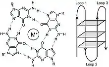Data has shown that TERRA interacts with telomeric DNA to form G-Quadruplex structures both in vitro and in vivo.[23][24] These structures form due to the abundance of guanine found in the TERRA transcript and their ability to associate through Hoogsteen hydrogen bonding. The resulting square planar structure is known as a guanine tetrad (also known as a G-tetrad or G-quartet) and when two or more guanine tetrads stack on top of each other, they form a G-quadruplex. These complex structures have been shown help to modulate telomere length through inhibition telomerase's ability to add tandem TTAGGG repeats, specifically in cells with long telomeres. This inhibitive effect seems to function in a telomere length-dependent manner;[3] that is, TERRA levels inversely correlate with increased activity of telomere elongation. In general, TERRA has been shown to be most abundant in cells with long telomeres,[2][3] while cells with short telomeres express comparatively lower levels of transcript expression. There is also evidence that overexpression of TERRA in human cells can help promote telomere processing by inhibiting the 5'-3' exonuclease Exo1 through the Ku70/80 dimer.[22][25]