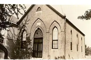 The Jewish congregation of Jefferson City built for themselves a synagogue on the west side of Monroe Street between High and McCarty in 1883. The building is 38 by 25 feet (11.6 m × 7.6 m) and constructed of brick and cut stone trimmings. The interior is neatly furnished and includes a Torah scroll handwritten on parchment. The original Torah written in 1811 is still in use today.[3][5] The Temple was designed by prominent local architect, Frank B. Miller, who also designed the Cole County Courthouse and Central Missouri Trust Company.[6][7] A plaque was placed in the building by the 12 founders in appreciation of women in the Hebrew Ladies Sewing Society who "by untiring exertion and labor have secured and presented to the congregation a house and a lot dedicated to the service of the most high."[3] The wording on the plaque is noteworthy because the women are listed by their first names, which was unusual for the time.