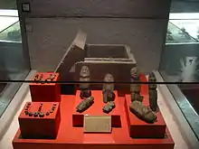 Most of the objects found in the Templo Mayor were offerings. Although many are of Mexica design, there are also abundant items from other peoples, brought in as tribute or through trade. Sculptures, flint knives, vessels, beads and other sumptuary ornaments—as well as minerals, plants and animals of all types, and the remains of human sacrifice—were among the items deposited in offerings. All of these fulfilled a specific function within the offering, depending on the symbolism of each object. In excavations at the Templo Mayor, different types of offerings have been found and have been grouped by researchers in terms of Time (the period in which the offering was deposited); Space (the location of the offering within the structure); Container (type and dimensions of the receptacle containing the objects); internal distribution (placement of objects within the offering) and value of the items. The offerings were usually contained in cavities, in stone urns, and in boxes made of slabs. These are found under floors; in platforms, architectural bodies, stairways and in temples. These offerings were placed accompanied by complex rituals following set temporal, spatial and symbolic patterns, depending on the intention of the offering.[25]