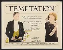 Temptation is a 1923 American silent drama film directed by Edward LeSaint and starring Bryant Washburn, Eva Novak, and June Elvidge. The film was released by the CBC Film Sales Corporation, which would later become Columbia Pictures.[1]