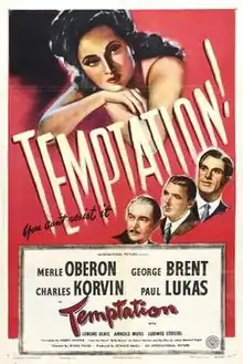 Temptation is a 1946 American film noir thriller film directed by Irving Pichel and starring Merle Oberon, George Brent, Charles Korvin and Paul Lukas. The film was based on Robert Smythe Hichens's 1909 novel Bella Donna. Other film adaptations of the novel were produced in 1915, 1923 and 1934.