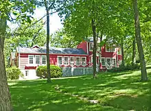 Over the years Lunt and Fontanne continued building and developing at Ten Chimneys. In 1936 they added the L-shaped swimming pool[11] and the cabana.[12] In 1938 they began remodeling and expanding the house, adding quarters for the cook and housekeeper and extra living space. The design was a collaboration between Lunt and architect Charles Dornbusch of Loebl, Schlossman and Demuth of Chicago, who helped with most of the structures on the estate, including the cottage fourteen years before. In 1939 they added the metal gate around the auto court. In 1947 they completed the new chicken coop (designed with advice from a specialist at the UW Ag Department) and greenhouse,[13] and the gatehouse.[14] Also in 1947 they reconstructed the Studio, a traditional hewn-log building that was taken apart in Sweden, shipped to America, and reassembled for use as a rehearsal space.[15] Flagstone paths and retaining walls were added later to tie the estate together.[5]