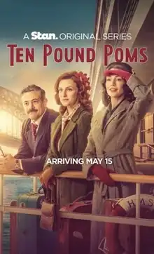 Ten Pound Poms is a British historical drama television series created by Danny Brocklehurst for BBC One and Stan. The series stars Michelle Keegan, Faye Marsay and Warren Brown as Ten Pound Poms, British citizens who migrated to Australia after the Second World War. The series premiered on 14 May 2023 on BBC One and has six episodes.[1] The first episode attracted an overnight audience of 4.6 million viewers.
