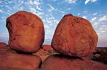 Mary Ann Dam is a popular recreation spot, easily accessible from town by road or bicycle track and popular for swimming, barbecues, picnics or bush walks. The area's best known attraction, Karlu Karlu / Devils Marbles Conservation Reserve, is 100 kilometres south of Tennant Creek and is one of the Territory's most photographed features. These huge granite boulders are scattered through a wide, shallow valley. The formations provide shelter to a variety of flora and fauna of the area and glow a rich red in the light of the early evening. Local Aboriginal mythology holds that the boulders are the eggs of the Rainbow Serpent. Visitors can take a self-guided walk from the car park. Bush camping facilities are available.