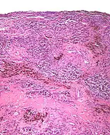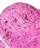 Micrograph of diffuse TGCT, also known as pigmented villonodular synovitis. H&E stain.