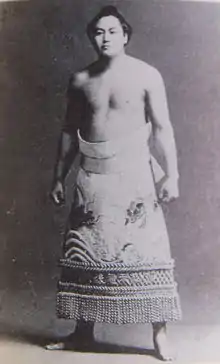 Born the third son of a farmer,[1] Tenryū was known as an intellectual.[2] He was a student in the electrical department of Kawate Technical School when he decided to enroll in professional sumo.[3] He was spotted by former yokozuna Hitachiyama and joined the Dewanoumi stable. He began his career in 1920, under the shikona, or ring name Mikatagahara (三方ヶ原), after a battle near his hometown. He entered the makuuchi division in May 1928 and was promoted to sekiwake in May 1930. He was a rival of Musashiyama[1] and was popular because of his techniques and handsomeness.[2]