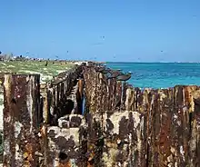 During WW2 in response to the Japanese use of the atolls and to provide a link with Midway, the island was expanded to allow for a landing strip.[2] The island was protected from the surf by a 5000-foot double steel pylon seawall, with walls separated by 4 feet (over 1 meter) finished in 1943.[2] The original seawall is composed of over 5000 steel pilings.[6] Maintenance on the wall was conducted by the U.S. Coast Guard between 1952 and 1979.[2]