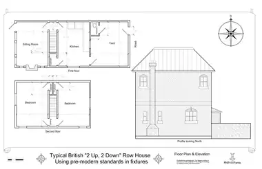The layout of a typical two-up two-down terraced house, including a yard and outside toilet.