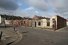 Since the 1950s, successive governments have looked unfavourably on terraced houses, believing them to be outdated and attempting to clear the worst slums.[25] Between 1960 and 1967, around half a million houses deemed unfit were demolished.[26] Tower blocks began to replace terraces in working class areas, though public opinion began to change against them following incidents such as the collapse of the Ronan Point tower block in 1968. By the 1970s, traditional urban terraces were being upgraded by fitting modern bathroom and heating systems, and began to become popular again.[27] Residents in Leeds began to protest against the blanket demolition of back to back houses, saying they were perfectly acceptable accommodation for the elderly and low-income households.[28]