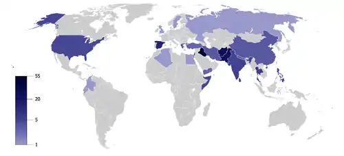 A map depicting the number of terrorist incidents occurring in the year 2009 across the world. Iraq, Pakistan, and Afghanistan are shown as having suffered the most attacks