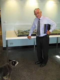 ![]() Snow and his blue heeler, Chilli. Snow is holding the book Canberra Airport: A Pictorial History (2009) by his wife, Ginette Snow. He is standing beside the model of Brindabella Business Park. | |