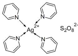 Tetrakis(pyridine)silver(II) peroxydisulfate is a chemical compound which contains silver in the rare oxidation state of +2.