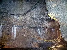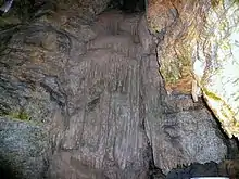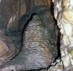 Continuing from the Great Dome, a short corridor on the left side of the entrance gallery leads to the chapel, which is considered the most beautiful room in the cave and extensively adorned with sinter deposits. Several stalactites up to one meter long were stolen by Americans after World War II, and another in the 1970s. The chapel boasts a diameter of approximately 5.5 meters and a height of about eight meters.[7] Within the chapel, various stalactite formations have received names based on their appearance. For instance, on one wall, there is the "waterfall," estimated to be around 85,000 years old, which extends to a total height of 2.75 meters.[5] Near the entrance of the chapel is the devil's head, while on another wall, in a small niche, one can find the devil's throat, a stalactite column referred to as Stalagnat, and in front of it, his tooth or that of his grandmother. A short staircase with a turnaround point ascends within the chapel, leading to a small passage that cannot be entered. Within this crevice lies a stalagmite resembling a woven beehive, with a diameter of about 15 centimeters and a height of approximately 30 centimeters.[4] Its age is estimated to be about 65,000 years.[5] Additional stalactite formations within the chapel include the devil's claw, also known as an elephant, and the devil's head with a goatee. The oldest dripstones in the cave are estimated to be up to 255,000 years old.[2]