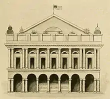 In 1817 John Davis engaged architect William Brand to design the Orleans Ballroom (Salle d'Orléans) next to the theatre.[5] It was the site of many subscription balls, carnival balls, and masquerades and catered to the most select of New Orleans society. For gala events the ballroom could be joined to the theatre, where temporary flooring was laid over the pit, making one enormous ballroom. The facilities also included gambling rooms, "for those unlucky at love."[6] When the noted American architect Benjamin Henry Latrobe visited in 1819, he judged it to be the best in the United States.[7] The Marquis de Lafayette was entertained here during his six-day visit in 1826.[8]
