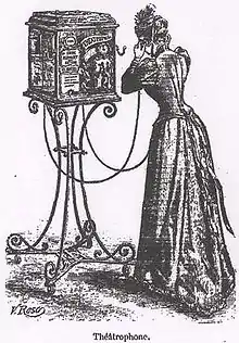 Théâtrophone ("the theatre phone") was a telephonic distribution system available in portions of Europe that allowed the subscribers to listen to opera and theatre performances over the telephone lines. The théâtrophone evolved from a Clément Ader invention, which was first demonstrated in 1881, in Paris. Subsequently, in 1890, the invention was commercialized by Compagnie du Théâtrophone, which continued to operate until 1932.
