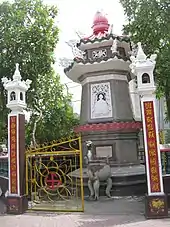 The body was re-cremated during the funeral, but Quảng Đức's heart supposedly remained intact and did not burn.[25] It was considered to be holy and placed in a glass chalice at Xá Lợi Pagoda.[31] The intact heart relic[25] is regarded as a symbol of compassion. Quảng Đức has subsequently been revered by Vietnamese Buddhists as a bodhisattva (Bồ Tát), and accordingly is often referred to in Vietnamese as Bồ Tát Thích Quảng Đức.[5][32] On 21 August, the ARVN Special Forces of Nhu attacked Xá Lợi and other Buddhist pagodas across Vietnam. The secret police intended to confiscate Quảng Đức's ashes, but two monks had escaped with the urn, jumping over the back fence and finding safety at the US Operations Mission next door.[33] Nhu's men managed to confiscate Đức's charred heart.[34]