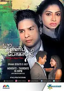 Thalli Pogathey (Tamil: தள்ளி போகாதே) is a 2017-2017 Singaporean-Tamil-language family soap opera starring Jaynesh, Indra, Vignesh, Vimala and Puravalan. It replaced mystery thriller Drama Yaar? and it broadcast on MediaCorp Vasantham on Monday through Thursday from 3 July 2017 to 21 September 2017 at 10:30PM (SST) for 45 Episodes.[1]