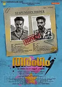 Tharangam (transl. Wave) is a 2017 Indian Malayalam-language fantasy black comedy film directed by Dominic Arun in his directorial debut. It was the first Malayalam film produced by Dhanush under his banner Wunderbar Films, and starring Tovino Thomas, Balu Varghese, Santhy Balachandran in the lead roles. Ashwin Renju is the music director. The film was released in India on 29 September 2017.