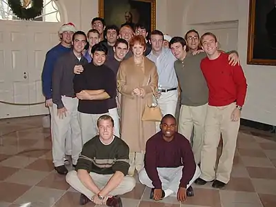 The Academical Village People (AVP) is an a cappella group at the University of Virginia founded in 1993 by a group of people who vowed to "never take themselves too seriously."[1] They set themselves apart from other groups by being able to keep professional while maintaining their lax attitude, wild antics while performing, and their less traditional uniform of a garage mechanic style shirt. The name "Academical Village People" comes from Thomas Jefferson's Academical Village at the university in Charlottesville, Virginia.[2] As of 2017, AVP, as it is often called for short, has released thirteen studio albums, including a greatest hits album, DECADEmical: Best of 1993-2003, of its first ten years in existence.[3] The group has recorded many notable performances such as opening for Dana Carvey[4] and Girl Talk, performing for Reba McEntire at the White House, concerts at the Kennedy Center, and performances in such countries as England, Spain, and Scotland.[5]