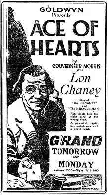 The Ace of Hearts is a 1921 American crime drama film produced and directed by Wallace Worsley. The screenplay by Ruth Wightman is based on Gouverneur Morris's[1] story The Purple Flask, which was serialized in two parts in Cosmopolitan magazine in 1917.[2] The film stars Leatrice Joy, John Bowers, Raymond Hatton and Lon Chaney. One unique feature of this film is that the main title of the movie isn't written on the screen; rather an Ace of Hearts card is shown in its place instead.