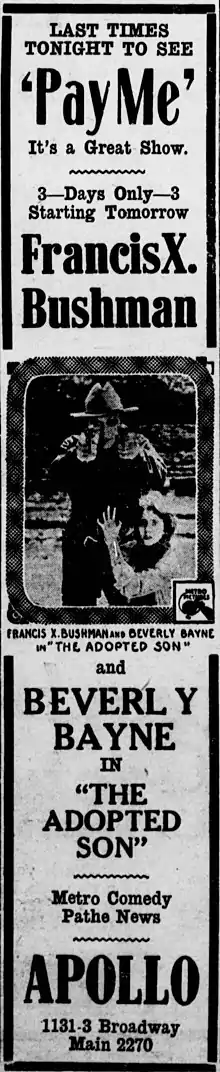 - ↑ "The Shadow Stage: The Adopted Son". Photoplay. December 1917. p. 124. Retrieved November 30, 2019.