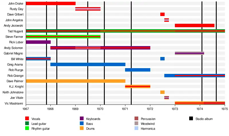 | Past members | Ted Nugent Dave Palmer Steve Farmer John Drake Rick Lober Bill White Greg Arama Andy Solomon Rusty Day K.J. Knight Rob Ruzga Rob Grange Andy Jezowski Vic Mastrianni Gabriel Magno Butch Giese |