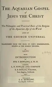 The Aquarian Gospel of Jesus the Christ (full title: The Aquarian Gospel of Jesus the Christ: The Philosophic and Practical Basis of the Religion of the Aquarian Age of the World and of the Church Universal) is a book by Levi H. Dowling. It was first published on 1 December 1908. Dowling said he had transcribed the text of the book from the akashic records, a purported compendium of mystical knowledge supposedly encoded in a non-physical plane of existence. In the later 20th century, it was adopted by New Age spiritual groups.