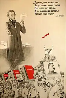 Pushkin's poem became particularly significant during the Soviet era. Pushkin depicted Peter as a strong leader, so allowing Soviet citizens to praise their own Peter, Joseph Stalin.[26] Stalin himself was said to be “most willingly compared” to Peter the Great.[27] A poll in Literaturnyi sovremennik in March 1936 reported praise for Pushkin's portrayal of Peter, with comments in favour of how The Bronze Horseman depicted the resolution of the conflict between the personal and the public in favour of the public. This was in keeping with the Stalinist emphasis of how the achievements of Soviet society as a whole were to be extolled over the sufferings of the individual.[26] Soviet thinkers also read deeper meanings into Pushkin's works. Andrei Platonov wrote two essays to commemorate the centenary of Pushkin's death, both published in Literaturnyi kritik. In Pushkin, Our Comrade, Platonov expanded upon his view of Pushkin as a prophet of the later rise of socialism.[28] Pushkin not only 'divined the secret of the people', wrote Platonov, he depicted it in The Bronze Horseman, where the collision between Peter the Great's ruthless quest to build an empire, as expressed in the construction of Saint Petersburg, and Evgenii's quest for personal happiness will eventually come together and be reconciled by the advent of socialism.[28] Josef Brodsky’s A Guide to a Renamed City "shows both Lenin and the Horseman to be equally heartless arbiters of other’s fates," connecting the work to another great Soviet leader.[29]