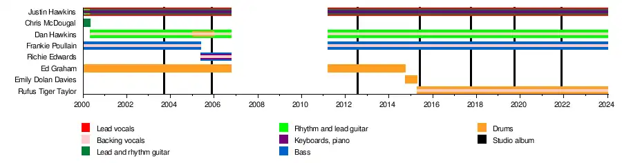 The Darkness are a British rock band that formed in Lowestoft, England in 2000. The band consists of Justin Hawkins (lead vocals, lead guitar), his brother Dan Hawkins (rhythm guitar, backing vocals), Frankie Poullain (bass guitar, backing vocals) and Rufus Tiger Taylor (drums, backing vocals).