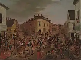 The Five Points is an early 19th century oil painting by an unknown artist, in the collection of the Metropolitan Museum of Art in New York City. [1] It is a reproduction of an oil painting by George Catlin depicting the chaotic lifestyle of New York's Five Points district, a notorious slum on the Lower East Side.