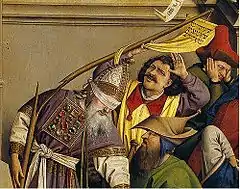 To the right is a grouping of "despairing Jews" who seem to be fleeing from the scene.[6] The figure on the far left of this group is a high priest who has been blindfolded,[4] symbolising his blinding to the true significance of Jesus.[9] A rabbi in the immediate foreground holds a Torah scroll with, according to historian Norman Roth, "gibberish Hebrew writing", while another "Jew shows a scroll to a figure, apparently Christian, who tears his clothing at the sight". In contrast to the Christians, the Jews do not wear grand, ceremonious hats or badges.[8]