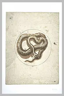 Winter or The Flood is most commonly referred to by its French title Le Deluge.[11] In this highly original painting Poussin depicts the final stages of the horrific cataclysm of The Flood with restraint. The picture records the moment when the floods are finally covering the plain with the last few rocky outcrops disappearing under the rising waters. The horizontal lines used in his other paintings to create a sense of order here lead the eye through the painting with increasing unease. The moonlit scene is colored in different shades of bluey grey, interrupted by flashes of lightning. The dim outlines of Noah's Ark can be made out floating on the calmer waters in the far distance. Contrasting with the jagged shapes of rocks and trees, the waterfall produces a horizontal backdrop for the frieze of stranded survivors in the foreground, uncertain of their impending doom.[12] Poussin ominously places a snake slithering across the rock on the left of the picture, a symbol often employed in his pictures to conjure up a sense of horror. Additionally, the presence of a snake plays a special iconographic role in the cycle, because it also serves as a reminder of the singular absence of a serpent in the Garden of Eden.[6][13]