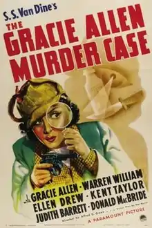 The Gracie Allen Murder Case is a 1939 American comedy mystery film taken from the Philo Vance series by writer S.S. Van Dine and directed by Alfred E. Green from a screenplay by Nat Perrin. The film stars the female member of the comedy duo Burns and Allen Gracie Allen, Warren William, Ellen Drew, Kent Taylor, Judith Barrett, Donald MacBride and Jed Prouty. The film was released on June 2, 1939, by Paramount Pictures.[1][2]