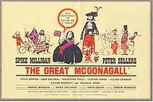 The Great McGonagall is a 1974 British comedy film directed by Joseph McGrath and starring Spike Milligan in the title role, Peter Sellers as Queen Victoria and Julia Foster as Mrs McGonagall.[1] It is a humorous biopic of the Scottish poet William McGonagall that includes several of McGonagall's actual poems, his appearing in the title role of Macbeth and his "improvement" of the Bard's plot, his pilgrimage to Balmoral Castle, the attempted assassination of Queen Victoria by Roderick McLean and a tribute to McGonagall from Lt Frederick Rollo of the Royal Scots in Zululand.[2][3]