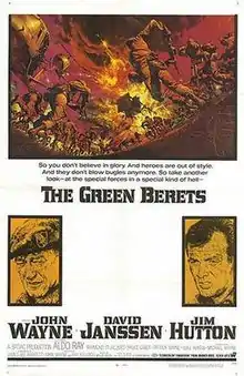 The Green Berets is a 1968 American war film directed by John Wayne and Ray Kellogg and starring John Wayne, David Janssen and Jim Hutton, based on the 1965 novel by Robin Moore. Much of the film was shot in the summer of 1967. Parts of the screenplay bear little relation to the novel, although the portion in which a woman seduces a North Vietnamese communist general and sets him up to be kidnapped by Americans is from the book.