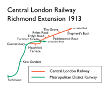 The station was to have been built on the CLR's planned underground extension from Shepherd's Bush to Gunnersbury proposed to parliament in November 1912.[1] The extension was to continue on the London and South Western Railway (L&SWR) surface tracks to Richmond already used by the District Railway (DR). The station would have been between Paddenswick Road to the west and Shepherd's Bush to the east.[2]