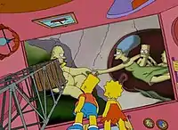 • During Homer's first performance, the shot pans upwards, past all the scenery to Lenny and Carl in the rafters, who comment on Homer's performance, a reference to Citizen Kane.