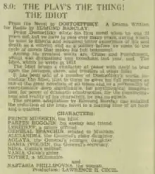 Barclay's adaptation has been called a "radio masterpiece".[3] It was one of a series of classical novel adaptations by Barclay for the Australian Broadcasting Corporation (ABC); Leslie Rees listed The Idiot among the best of these.[4]