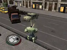 Assessments of the graphics were also mixed. Goldstein noted that "the Hulk looks good, but the city isn't so spectacular. It's nice that everything can be destroyed, but it's not enough to overcome the rest of the mediocrity".[3] McShea lambasted the graphics as "startlingly incomplete", citing the short draw distance (which he described as "more reminiscent of a post-eruption Pompeii than modern-day New York City"), uneven frame rate, and the game's tendency to crash during particularly hectic action.[1] Sterling McGarvey of GameSpy, as well as Dan Whitehead of Eurogamer and Orry, regarded the Hulk's model as the game's sole visual advantage.[2][31][44] McShea and McGarvey were disconcerted by the distorted likenesses of the film's actors, with McShea describing the cutscene models as "look[ing] like they were recently attacked by a hive of killer bees".[1][31] Whitehead remarked that "everything else looks no better than Ultimate Destruction, and sometimes looks a whole lot worse", and he additionally cited dramatic drops in the frame rate and numerous glitches.[2] Chris Andrien of GameRevolution deemed the graphics mediocre and more comparable to particularly impressive graphics of the previous generation than to contemporary high-definition visuals.[25] Nick Suttner of 1Up.com considered the detail and textural variety to be superior to that of The Incredible Hulk: Ultimate Destruction, but said that the draw distance was worse and the realistic aesthetic was less fitting.[22] Reiner, however, admired the graphics as "a showcase of destruction and mayhem" complemented by "a stunning fireworks-like display of smoke, debris, and bodies flying through the air".[24] Chuck Osborn of Official Xbox Magazine also held the graphical detail in positive regard.[41] The PlayStation 2, Wii and PC versions were heavily criticized for their poor graphical quality and stripped-down details, particularly the shortened draw distance, reduced city population, and weaker destruction effects.[lower-alpha 3]
